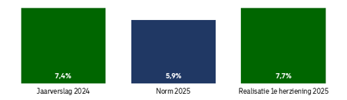 Het gemiddelde verzuim van de afgelopen 12 maanden lag eind april 2025 op 7,7%. Dat is 0,3% hoger dan eind 2024 en 0,8% hoger dan een jaar geleden. Deze stijging wordt vooral veroorzaakt door een verdere stijging van het langdurig verzuim.